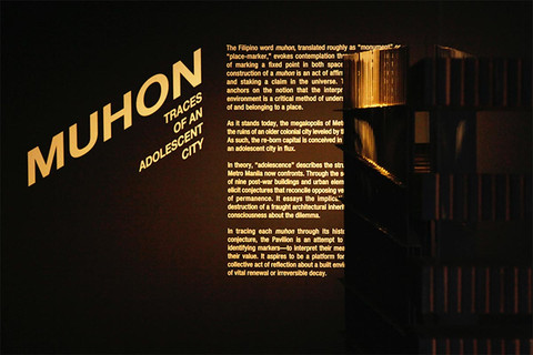 L’istallazione, allestita all’ultimo piano di Palazzo Mora, ha per titolo “Muhon: Traces of an Adolescent City”. Il programma espositivo si e’ ispirato alla juvenile city cresciuta sulle macerie della vecchia città coloniale di Manila, distrutta durante la Seconda Guerra Mondiale. Scopo principale dell’iniziativa e’ quello di interrogarsi sull’indifferenza ed abbandono di alcuni edifici ed elementi urbani “brutalisti” del dopoguerra e sugli effetti che certe discutibili scelte, dettate principalmente da interessi economici e disinteresse, hanno avuto e stanno avendo sulla identità di Manila e della sua società.
